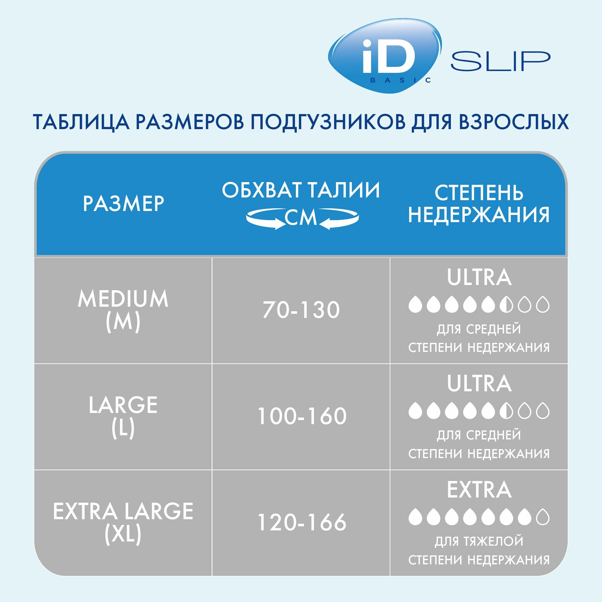 Подгузники для взрослых iD SLIP BASIC, размер L, 30 шт, обхват талии 100-160 см, для средней степени недержания