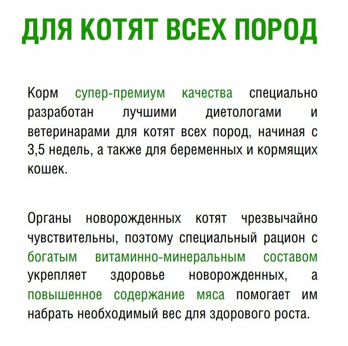 | Плюсы: | Котёнок 4 месяца ест с удовольствием , усваивается хорошо, со стулом всё в порядке |