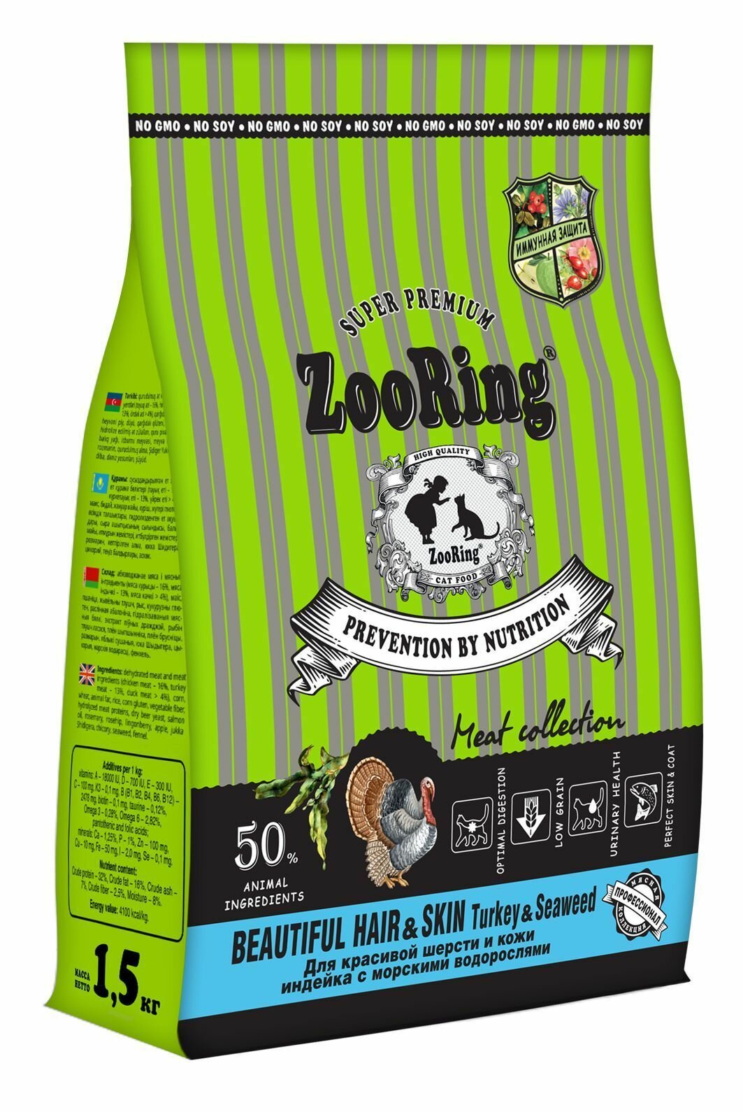 Сухой корм ZooRing Beautiful Hair&Skin Turkey индейка с морскими водорослями для кошек, 1,5кг