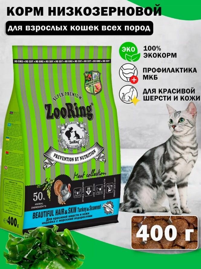 Купить Сухой корм ZooRing Beautiful Hair&Skin Turkey индейка с морскими водорослями для кошек, 400г
