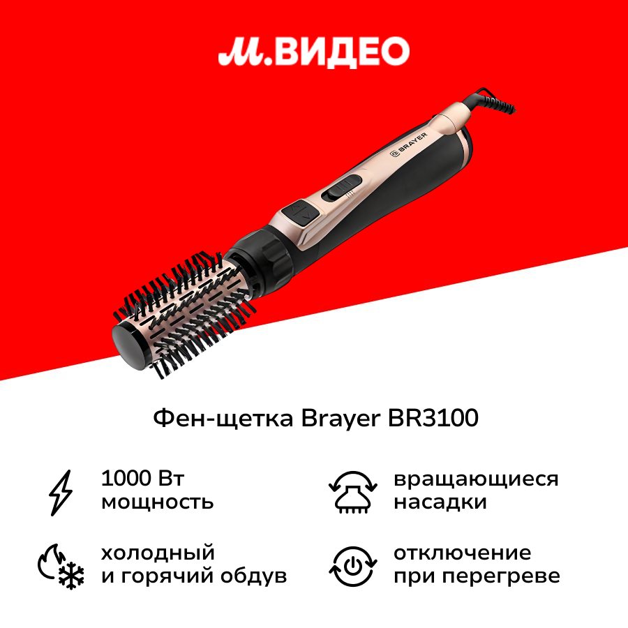 Фен -щетка BRAYER BR3100, 1000 Вт, 3 насадки: 35, 40, 50 мм, 2 скорости, шнур 1,8 м интересное: