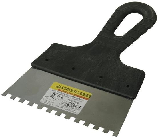 Шпатель STAYER "PROFESSIONAL" нержавеющий зубчатый с пластмассовой ручкой, 100мм, зуб 4х4мм