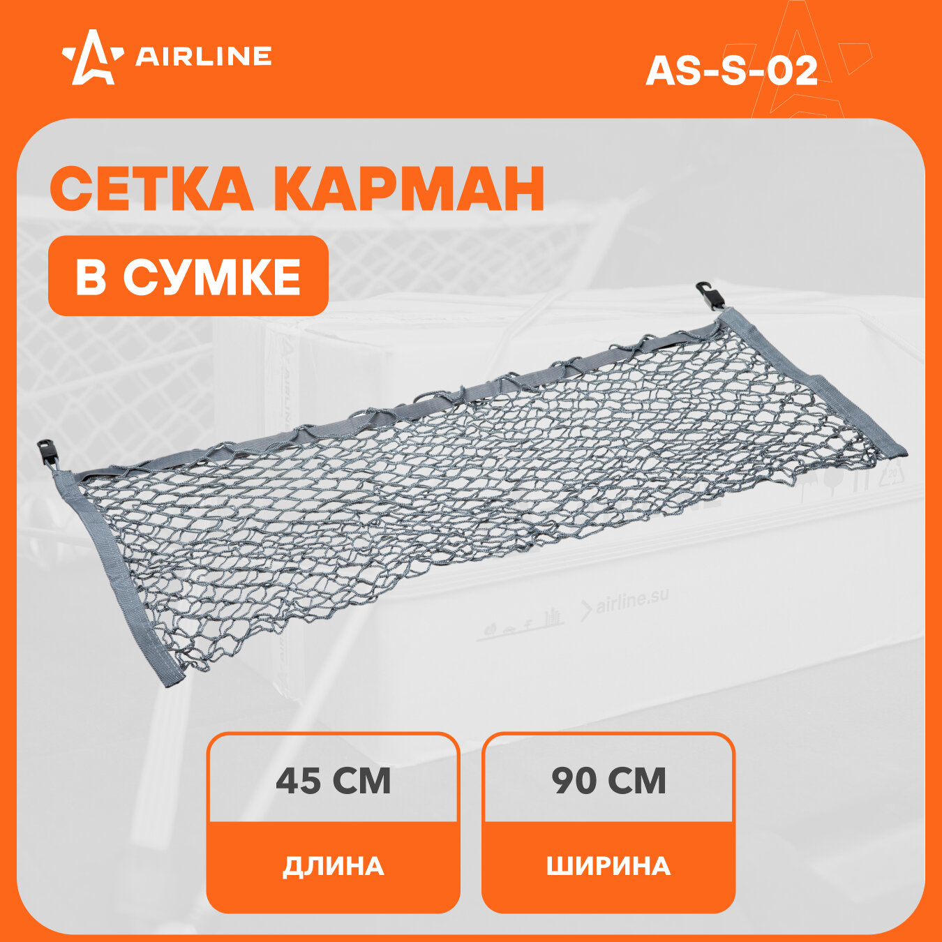 Airline as-s-02 сетка-карман в багажник автомобиля 90х45см серая 2 крючка и 2 крючка-самореза сумка, AIRLINE ASS02 (1 шт.)