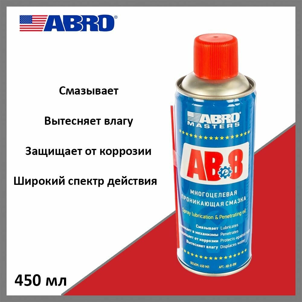 Смазка проникающая (жидкий ключ) ABRO Masters AB-8, многоцелевая, антикоррозийная, аэрозоль 450мл, арт. AB-8-R