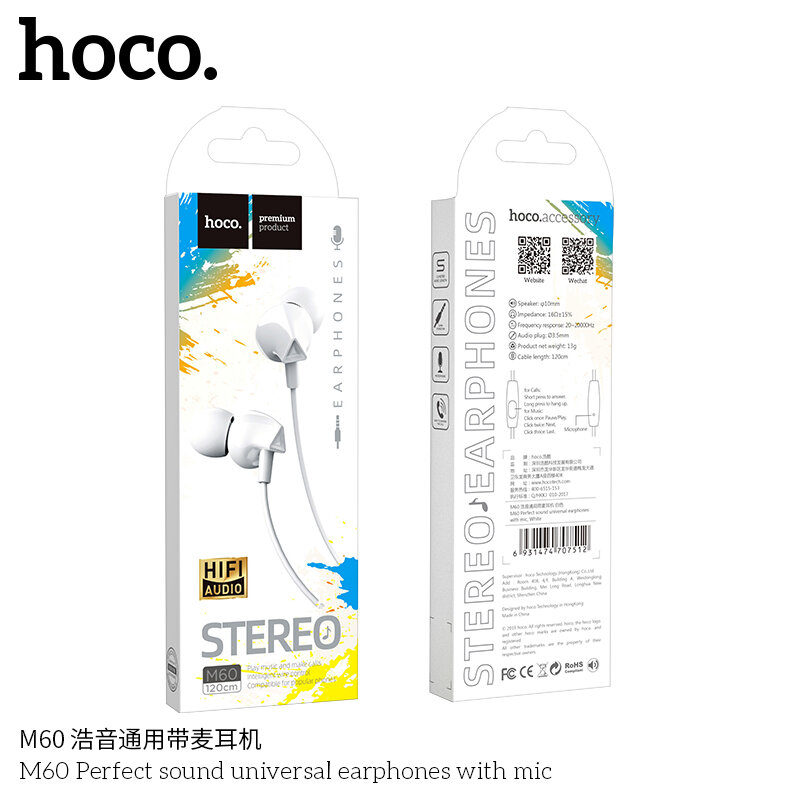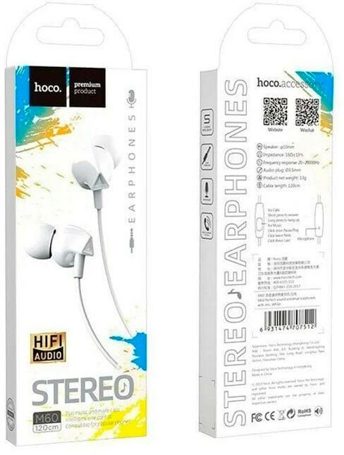 Наушники M60 Perfect sound universal earphones with mic, hoco, белые