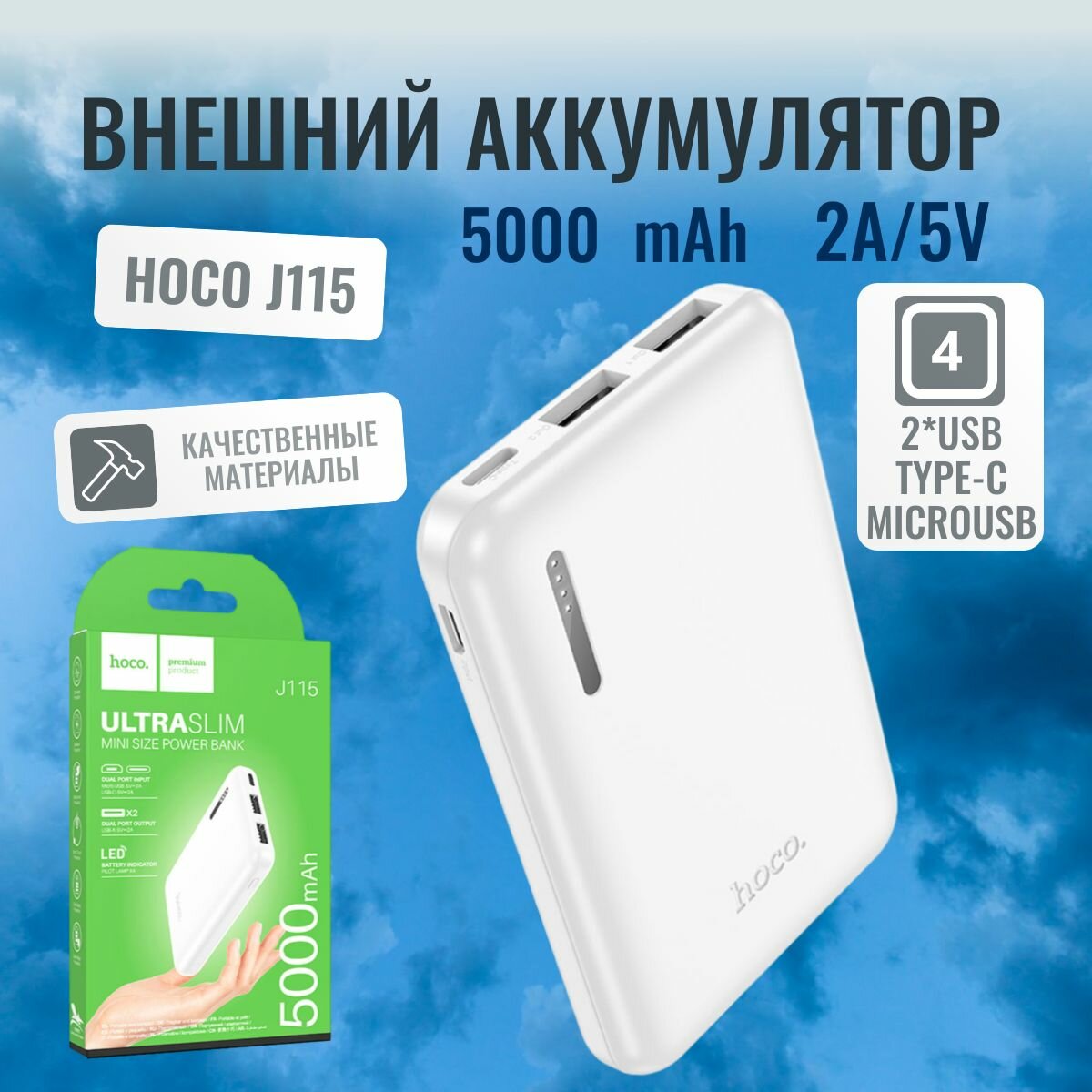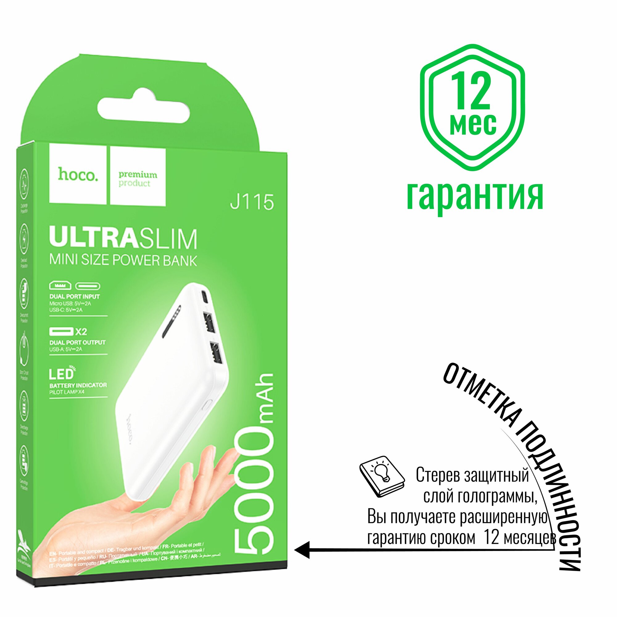 СохранитьЧетырехпортовый внешний аккумулятор Hoco J115 5000mAh. 2*USB, Type-C, microUSB. Цвет белый интересное: