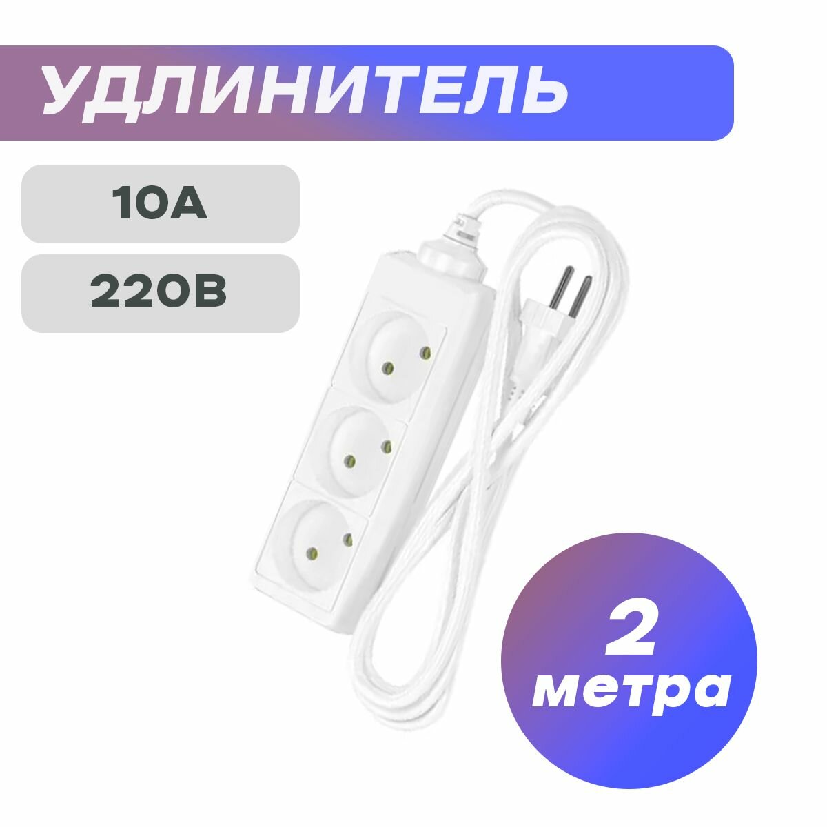 Удлинитель сетевой для розетки фотон 10А 2м 3 розетки белый, ГОСТ