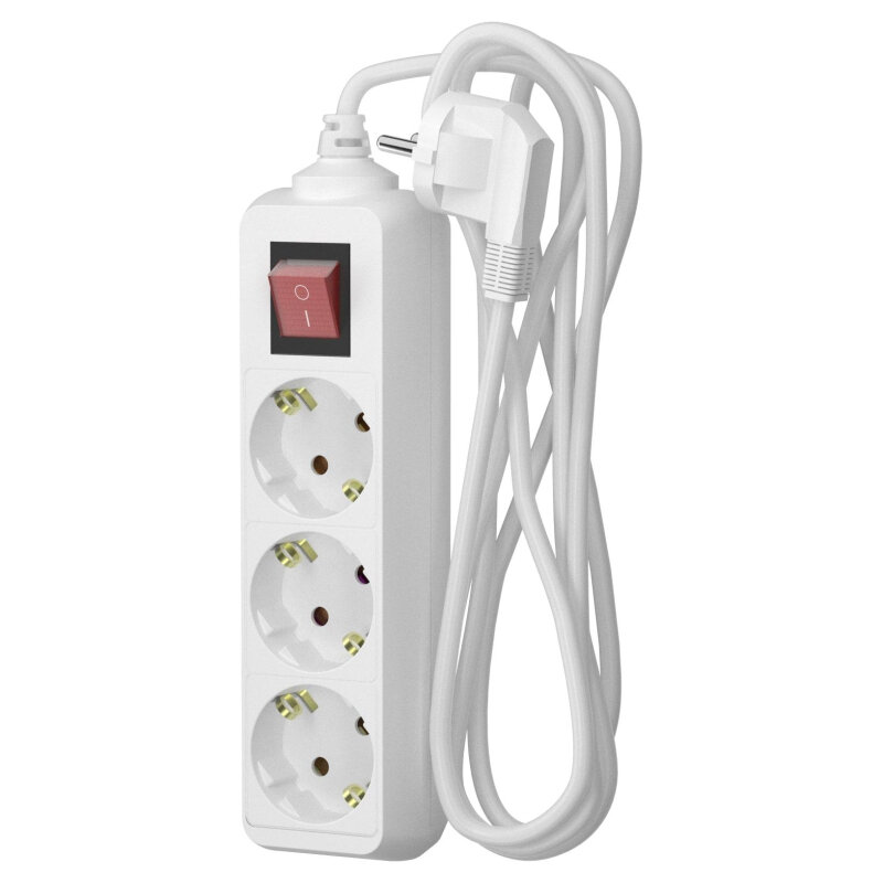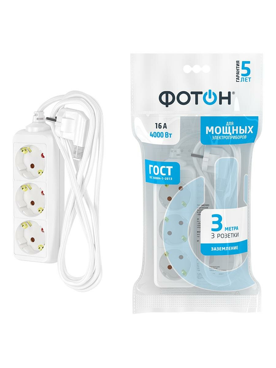 Купить Удлинитель для гирлянды сетевой для розетки фотон 16А 3м 3 розетки с заземлением белый, ГОСТ