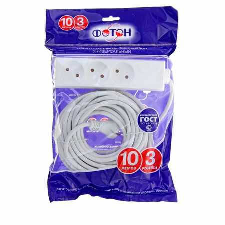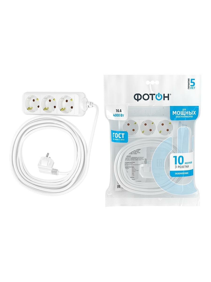 Удлинитель сетевой для розетки фотон 16А 10м 3 розетки с заземлением белый, ГОСТ