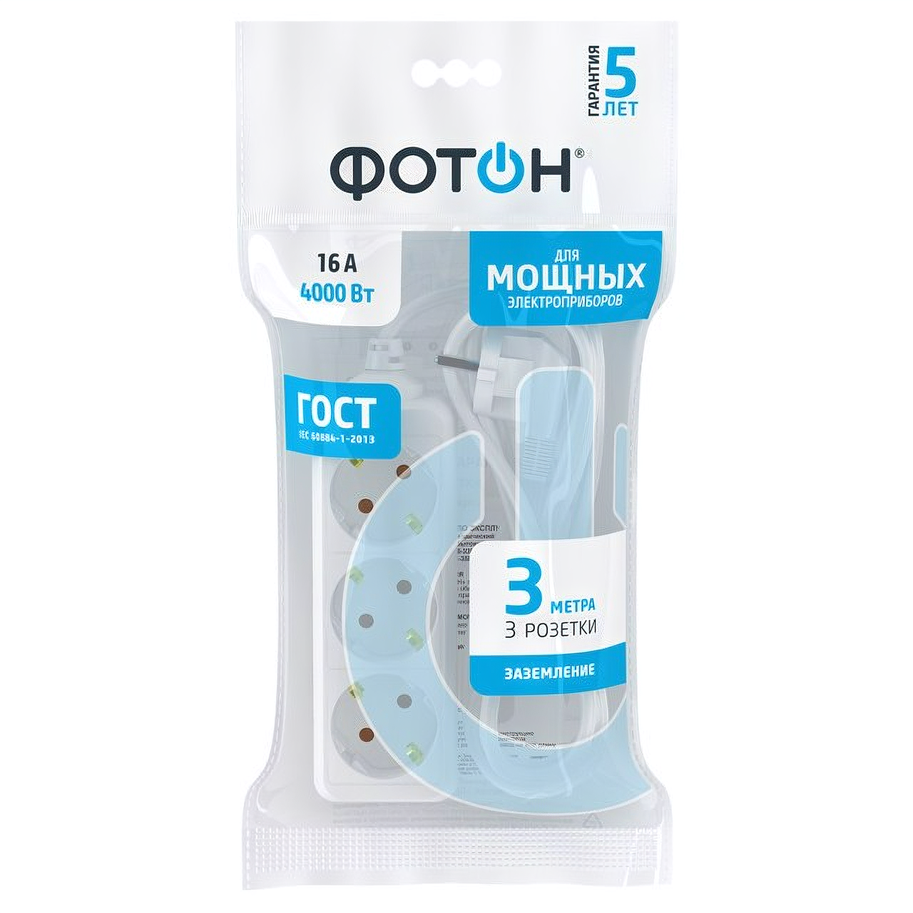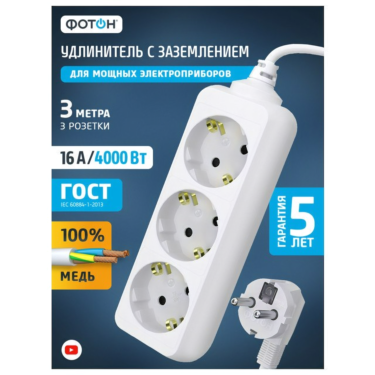 Удлинитель сетевой для розетки фотон 16А 5м 3 розетки с заземлением белый, ГОСТ