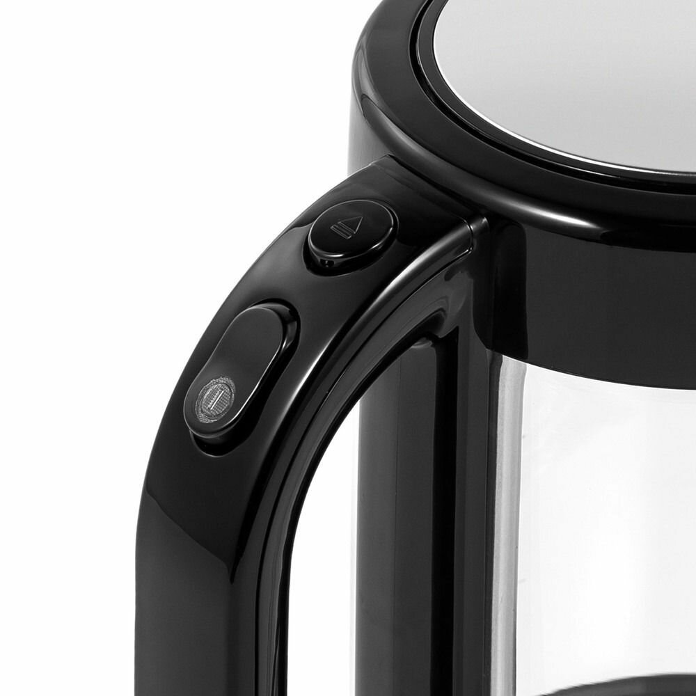 Стеклянная колба - видно, сколько воды налито, можно наблюдать за процессом закипания. Приятный минималистический дизайн. Удобная ручка. Все кнопки сосредоточены на верхней части ручки (для меня удобно). Носик не подтекает. Не шумный. Быстро закипает. Большой объем, но можно кипятить и немного (минимум 0,5 л).