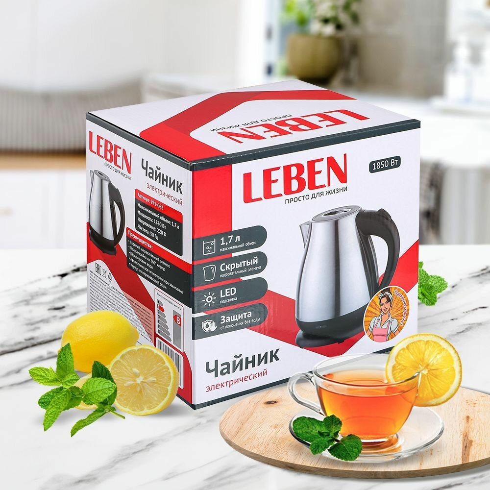 Купить Чайник электрический 1,7 л LEBEN, 1850 Вт, скрытый нагревательный элемент, автоотключение, нержавеющая сталь