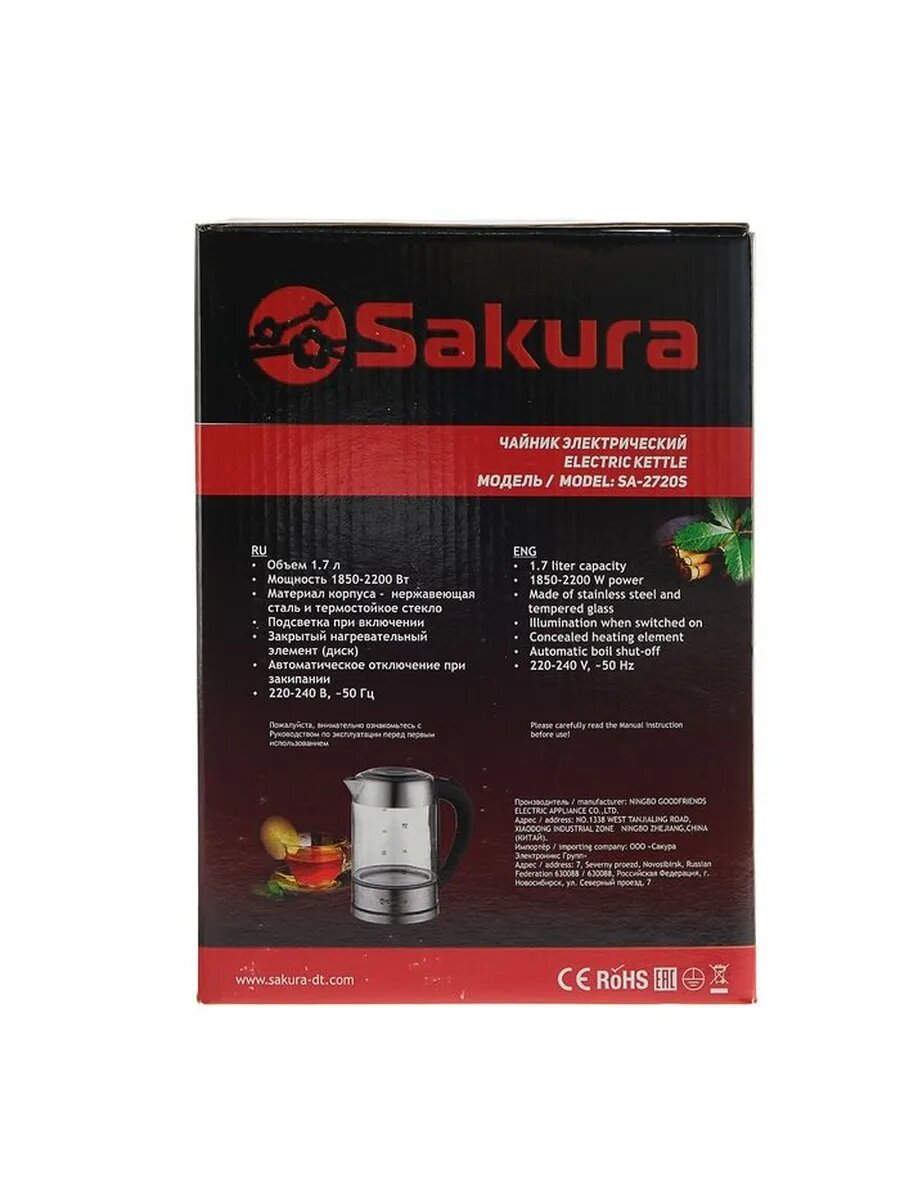 Купить Чайник электрический SAKURA SA-2720SBK 1.7л, 2200Вт, нержавеющая сталь, закаленное стекло