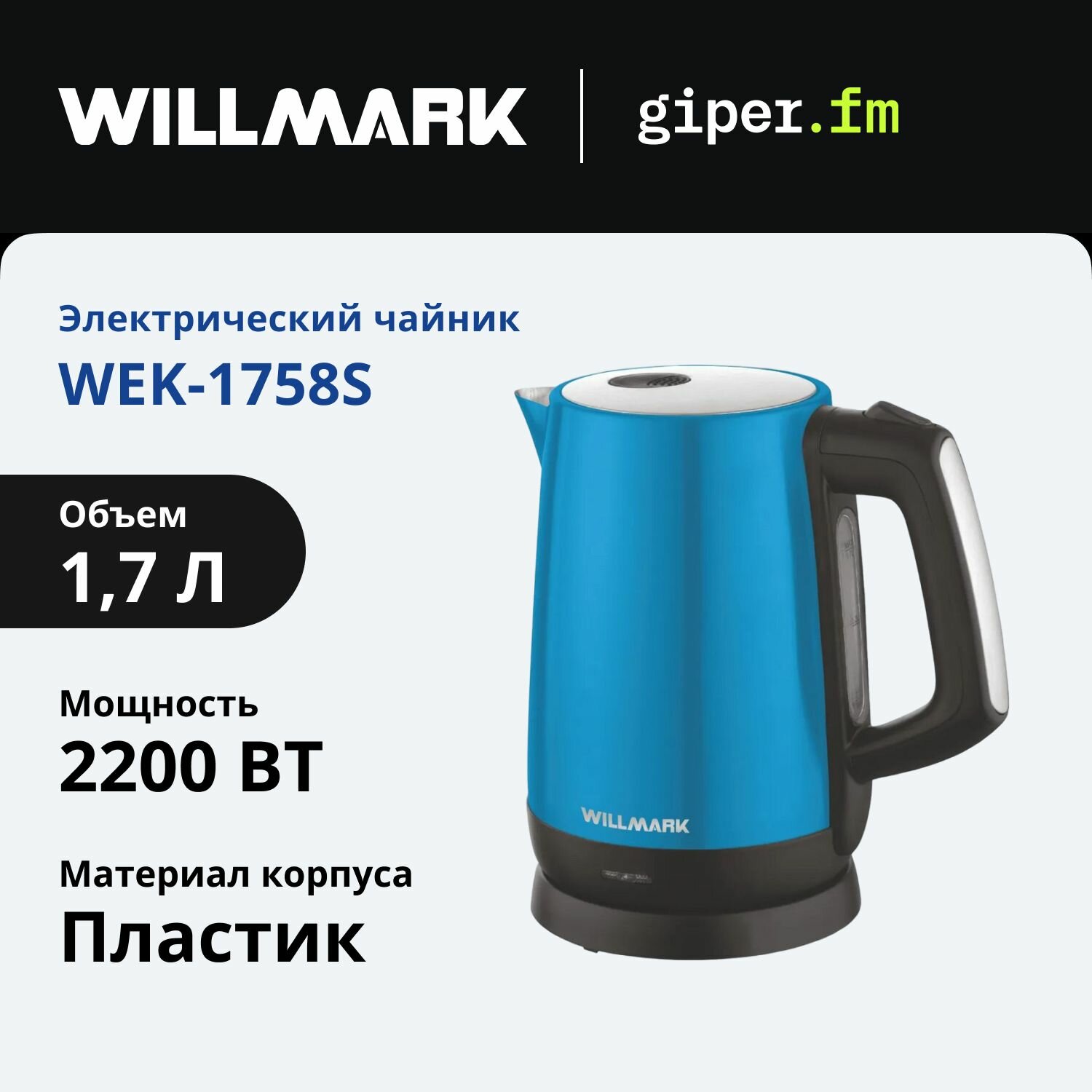 Купить Чайник электрический WILLMARK WEK-1758S 1.7 л, 2.2 кВт, голубой