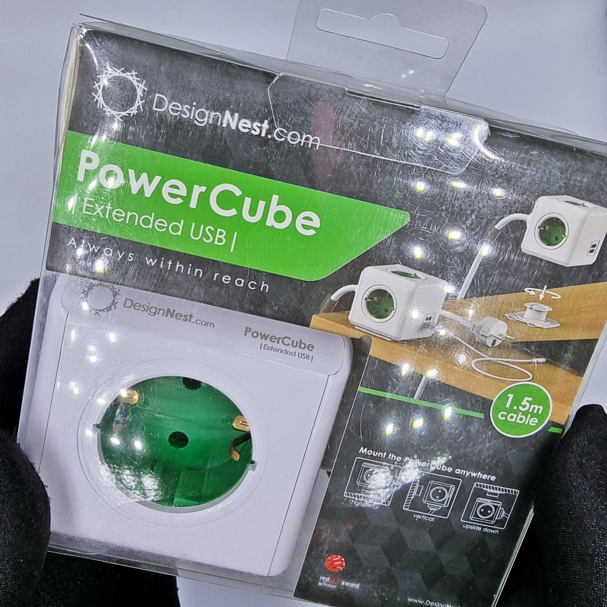 Сетевой удлинитель (фильтр) Allocacoc/DesignNest PowerCube Extended USB RED1402GN/DEEUPC, 4 розетки, 2 USB, провод 1,5 метра, крепление в комплекте, зеленый