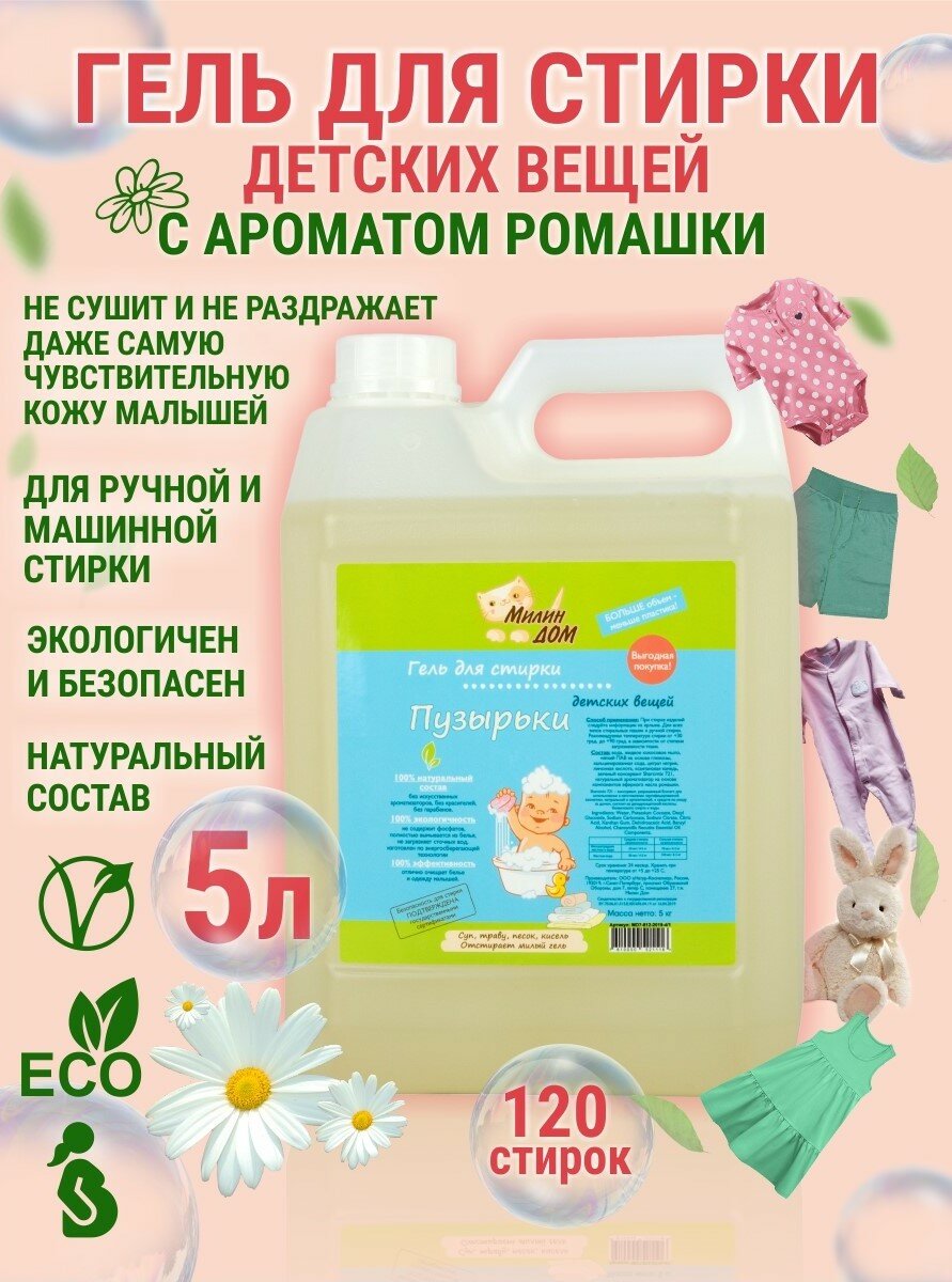 Гель для стирки детской одежды Милин Дом "Пузырьки" жидкий порошок с ароматом ромашки гипоаллергенный, 5 литров интересное:
