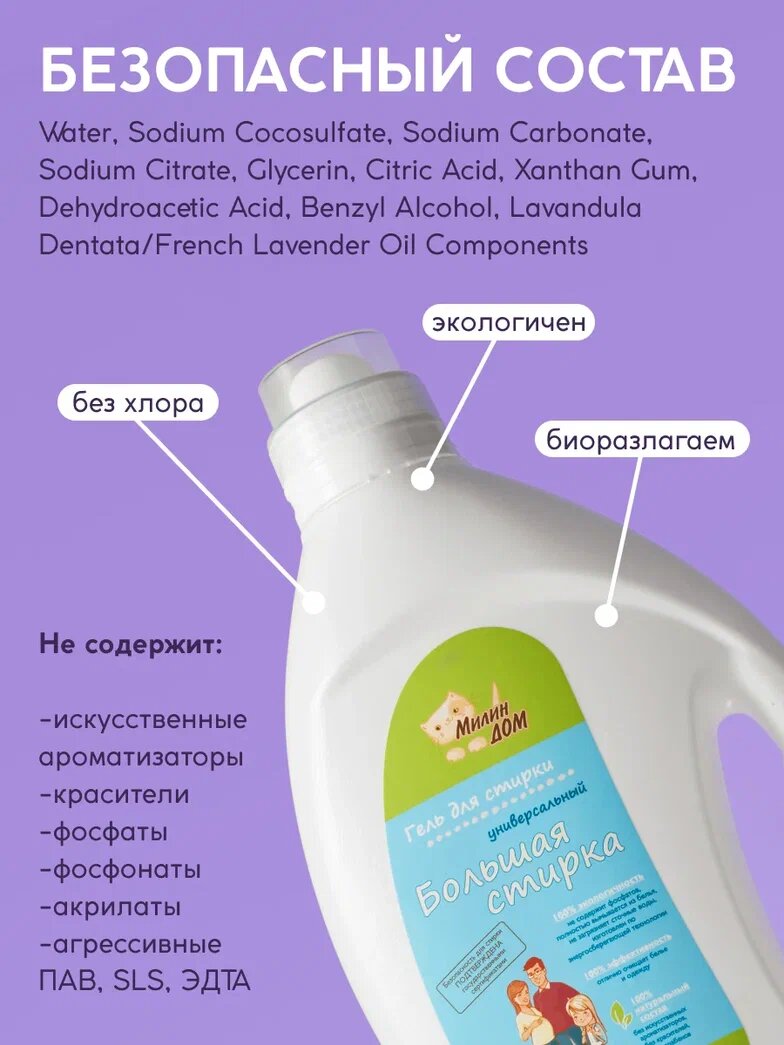 Купить Гель для стирки Милин Дом универсальный "Большая стирка" жидкий порошок для цветного черного белого белья с ароматом лаванды, 2 литра