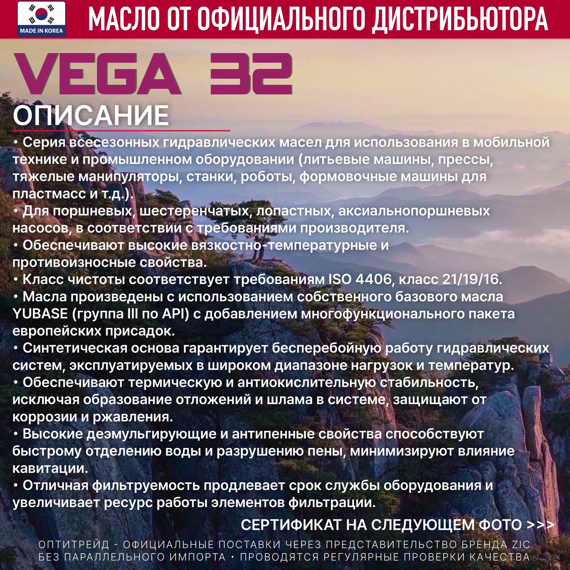 Zic Vega 32 (20L)_Масло Гидравлическое!Синт Din 51524 Part-2 (Hlp), Iso 11158, 6743/4 (Hm/Hr) Zic арт. 192634