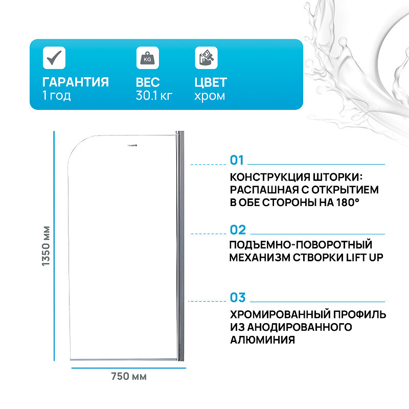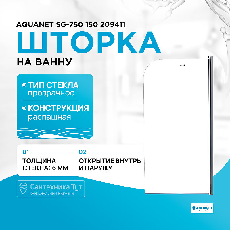 Шторка на ванну Aquanet SG-750 150 209411 профиль Хром стекло прозрачное интересное: