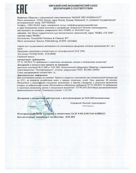 MOBIL 112610 Масло трансмиссионное минеральное ATF 3309 , 0.946л 1шт