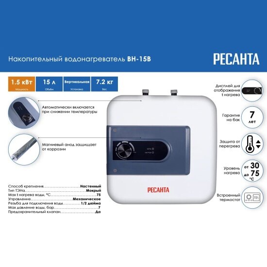 Водонагреватель накопительный ВН-15В Ресанта 74/5/6