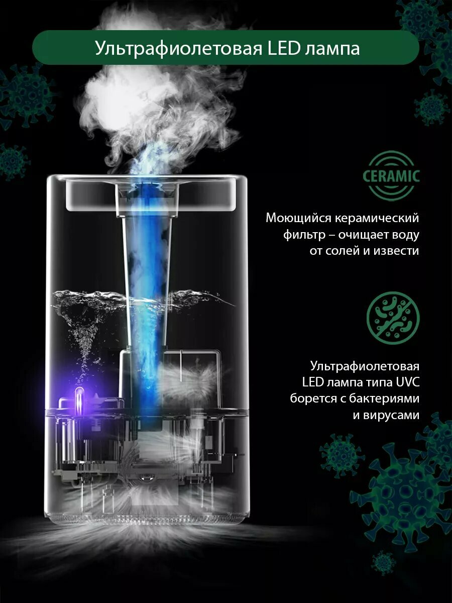 Заливка воды сверху, прямо во время работы, не нужно выключать и переворачивать бачок, как в других моделях. Работает достаточно тихо, ночью спать не мешает. Есть ночной режим экрана, в итоге он не светится ночью и не мешает спать. Поток "холодного пара" хороший, три уровня мощности. Есть керамический фильтр Есть УФ лампа Есть отсек для ароматизаторов и прочих добавок |