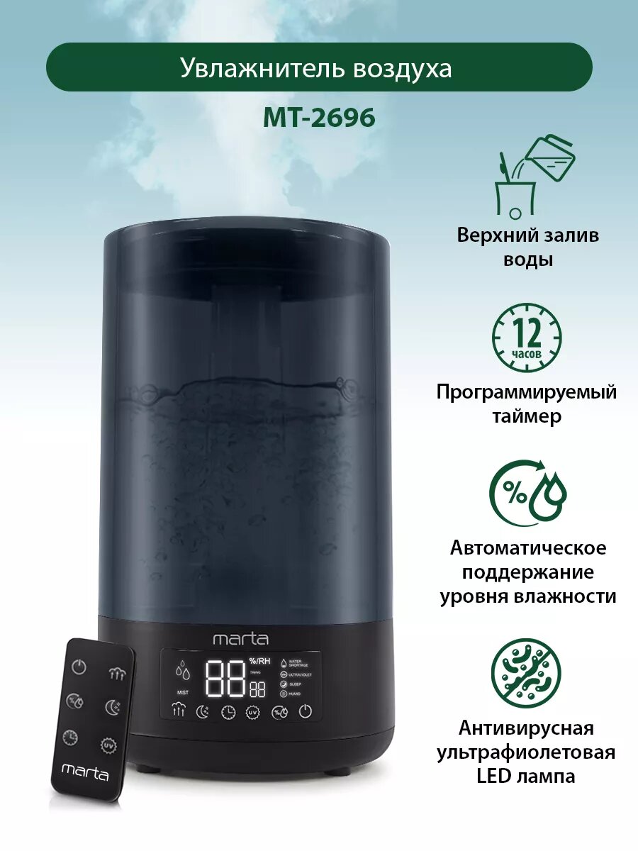 MARTA MT-2696 {черный жемчуг} увлажнитель воздуха с антивирусной УФ-лампой