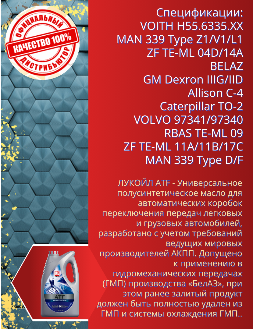 ЛУКОЙЛ ATF (4L)_жидкость гидавлич.! красн.полус.\ Dexron IIIG, ZF TE-ML 04D/14A,MAN 339 Type Z-1/V-1