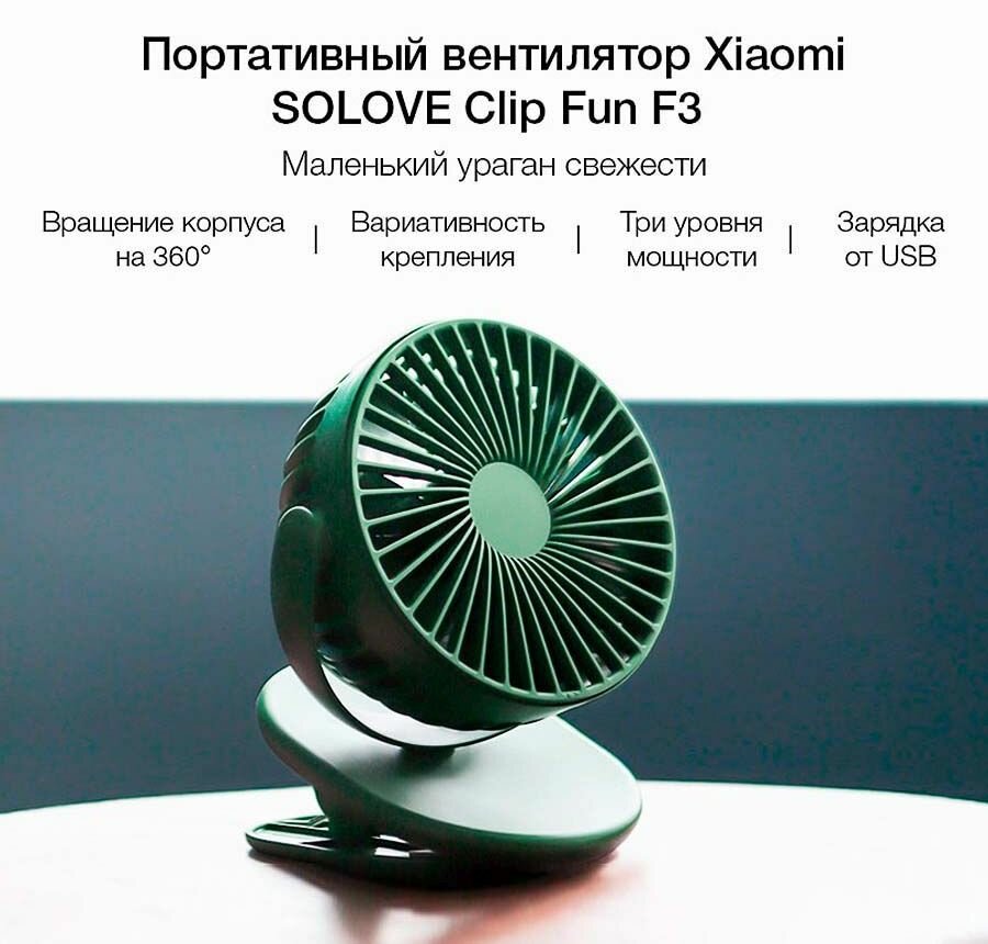 Портативный вентилятор Xiaomi Solove F3, клипса, 3 скорости, Type-C, 2000 мАч, зеленый