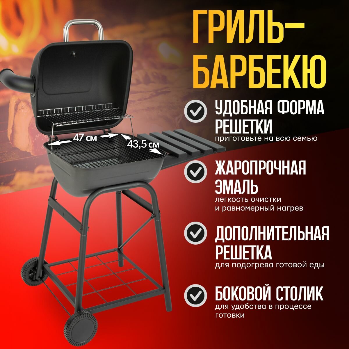 Компактный, для небольшой семьи отличный размер , угля входит ровно на 1 стартер. Коптили, жарили, запекали все прекрасно получается. Удобная полка для готовых продуктов ,чтобы не остывали пока что-нибудь ещё готовишь. |