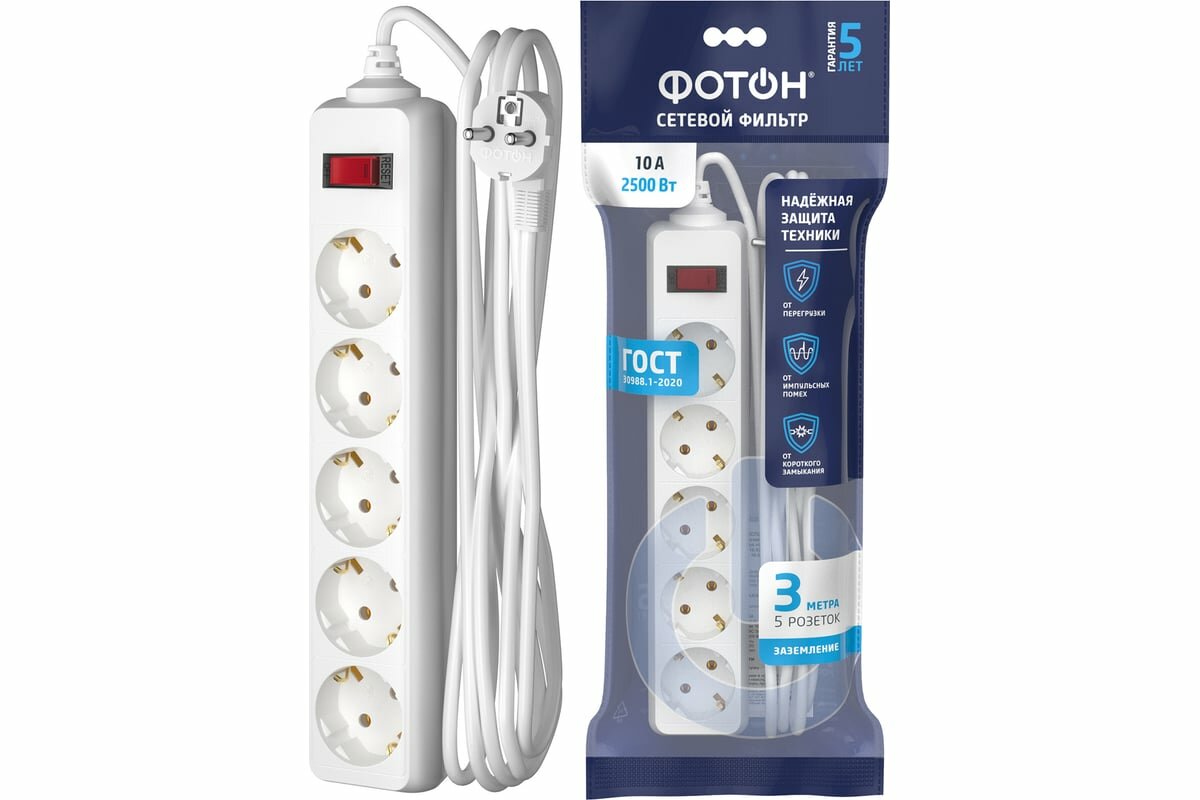 Сетевой фильтр удлинитель фотон 10А 3 метра 5 розеток с выключателем с заземлением белый, ГОСТ