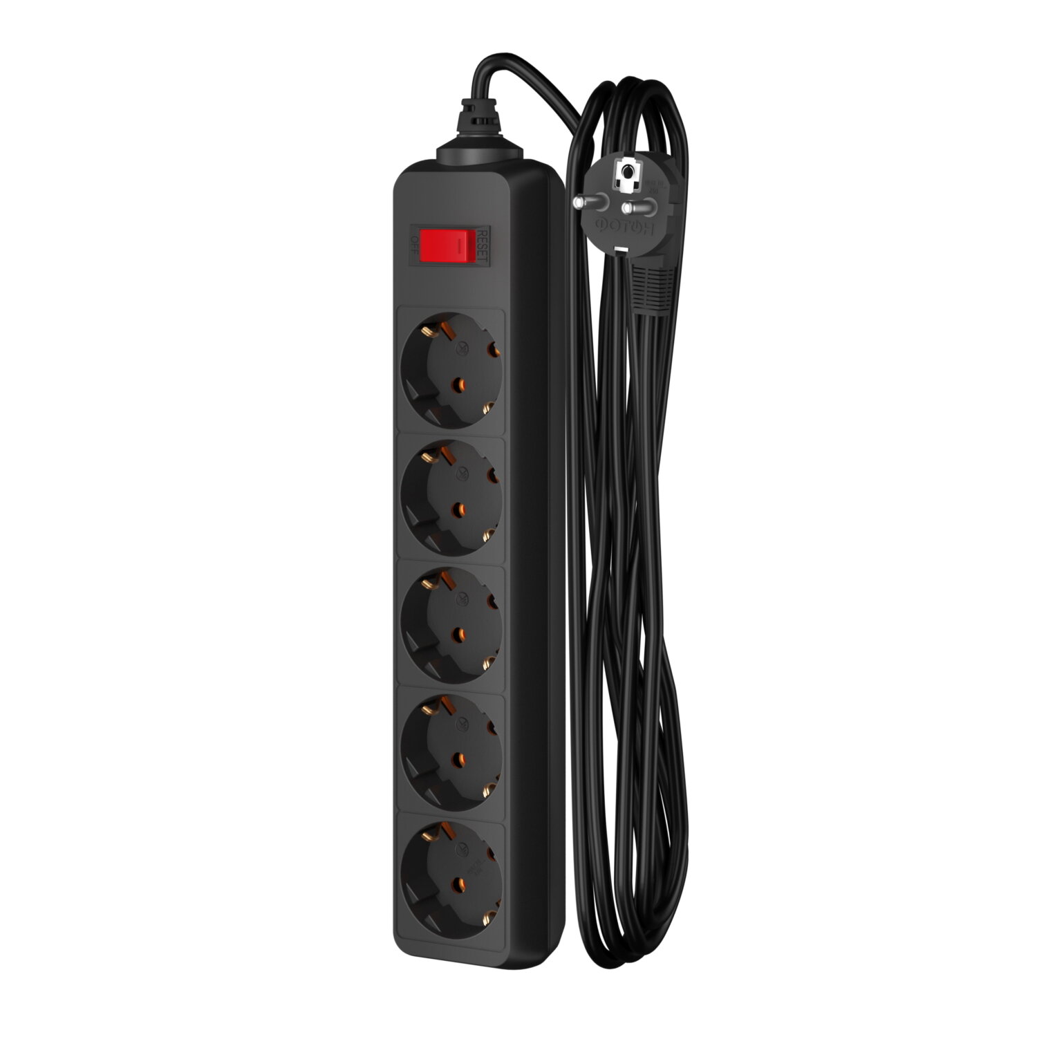 Сетевой фильтр удлинитель фотон 10А 5 метров 5 розеток с выключателем с заземлением черный, ГОСТ