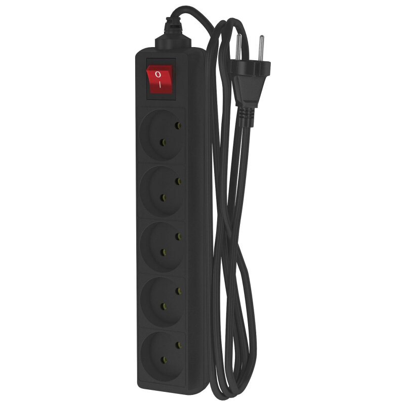 Сетевой удлинитель фотон 2 м, 5 розеток, 16А, с выкл., с заземлением черный 22729