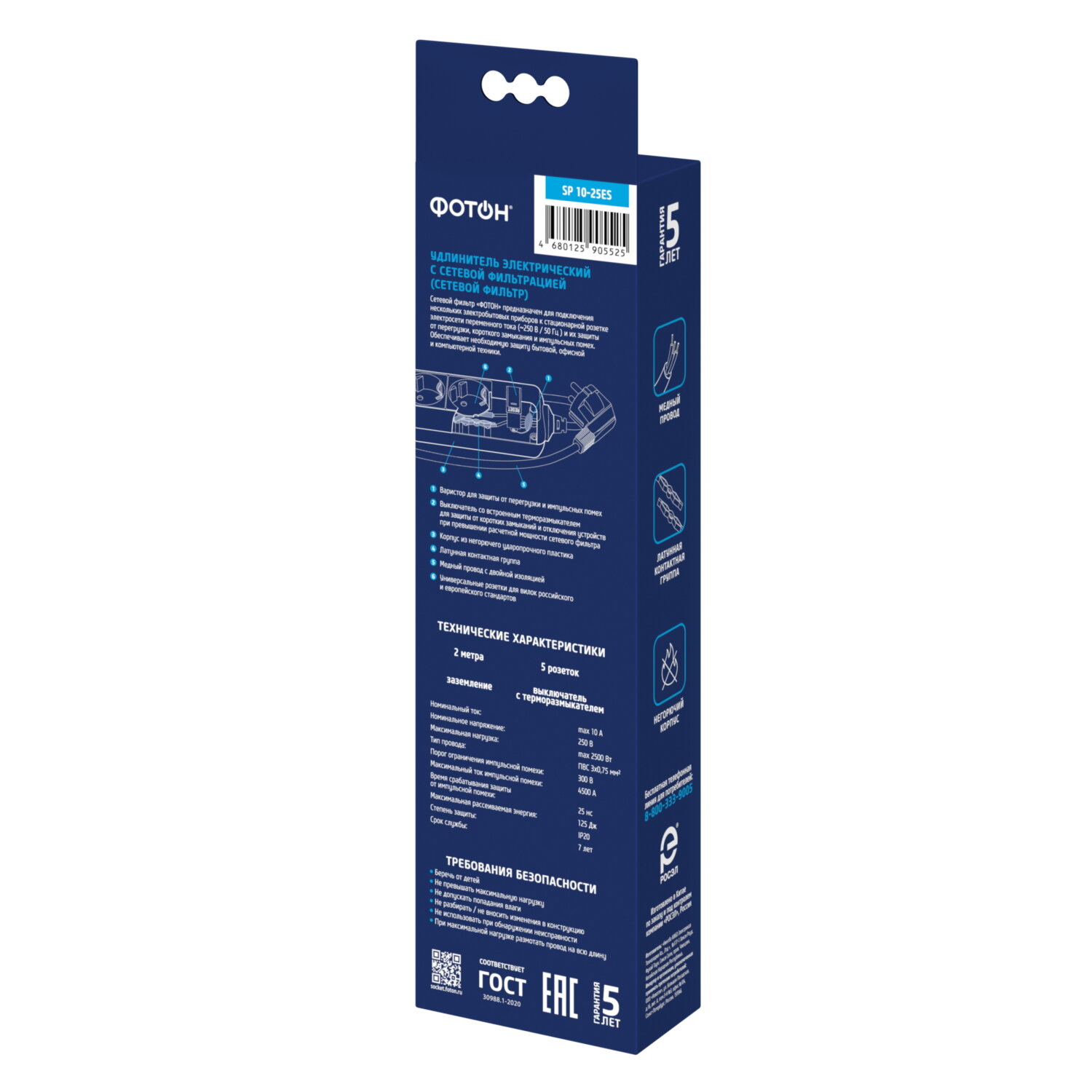 Сетевой фильтр удлинитель фотон 10А 5 метров 5 розеток с выключателем с заземлением белый, ГОСТ