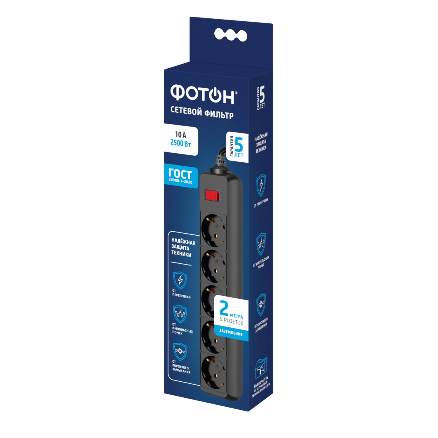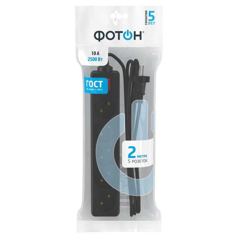 Сетевой фильтр удлинитель фотон 10А 2 метра 5 розеток с выключателем с заземлением черный, ГОСТ