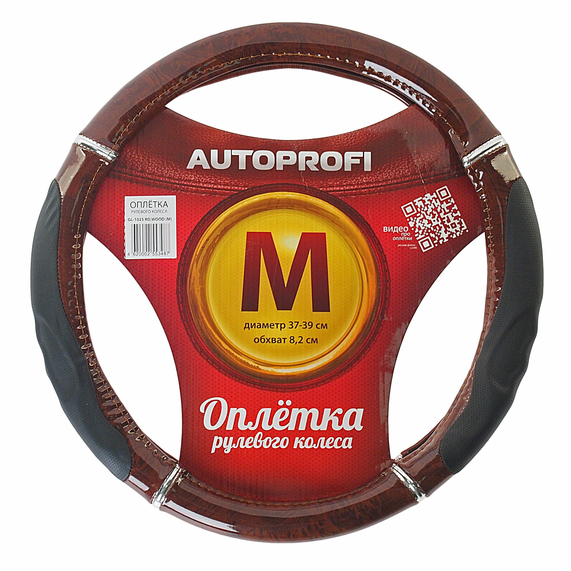 AUTOPROFI GL-1025 RD.WOOD (M) Оплетка руля M Autoprofi гелевая хром-кольца рельефная красное дерево 1шт