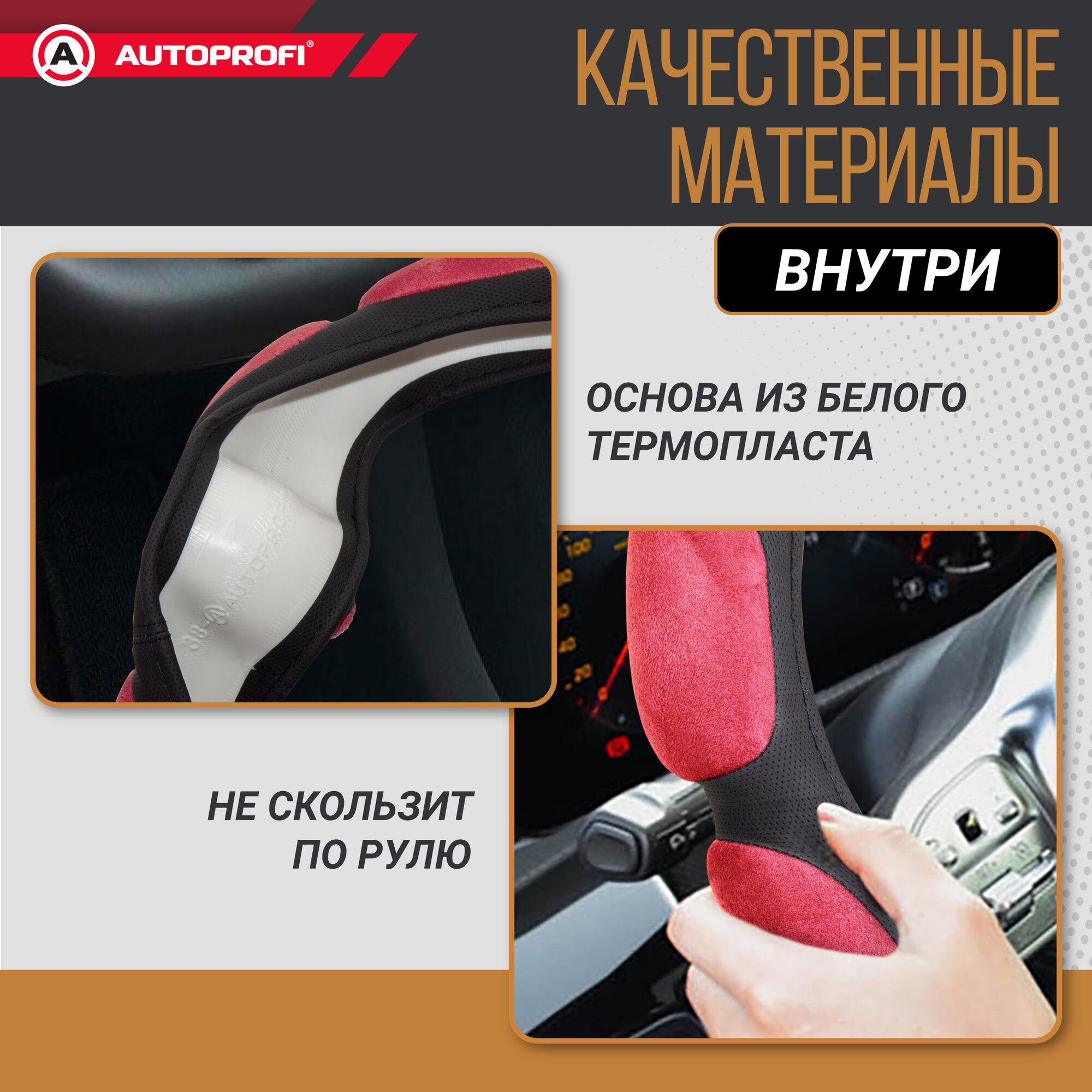 Оплетка на руль AUTOPROFI M 38см алькантара 6 подушек 2 см поролон с памятью, черн/красная