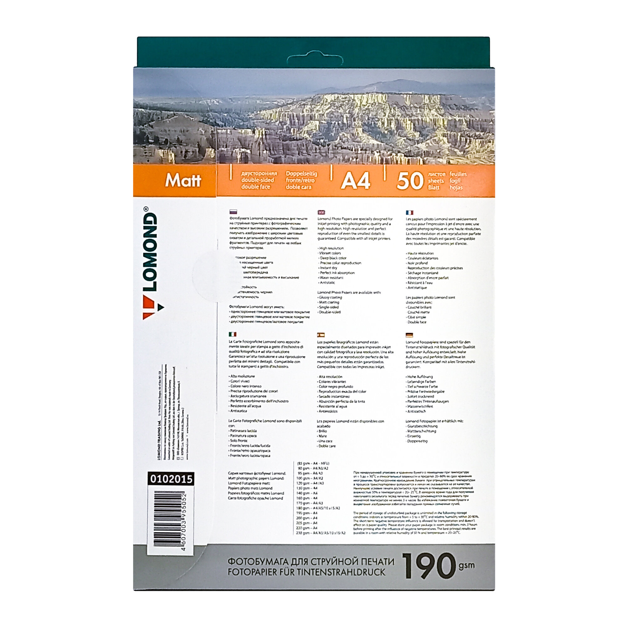 190 г/м², А4, Матовая двухсторонняя фотобумага, 50 листов Lomond 0102015