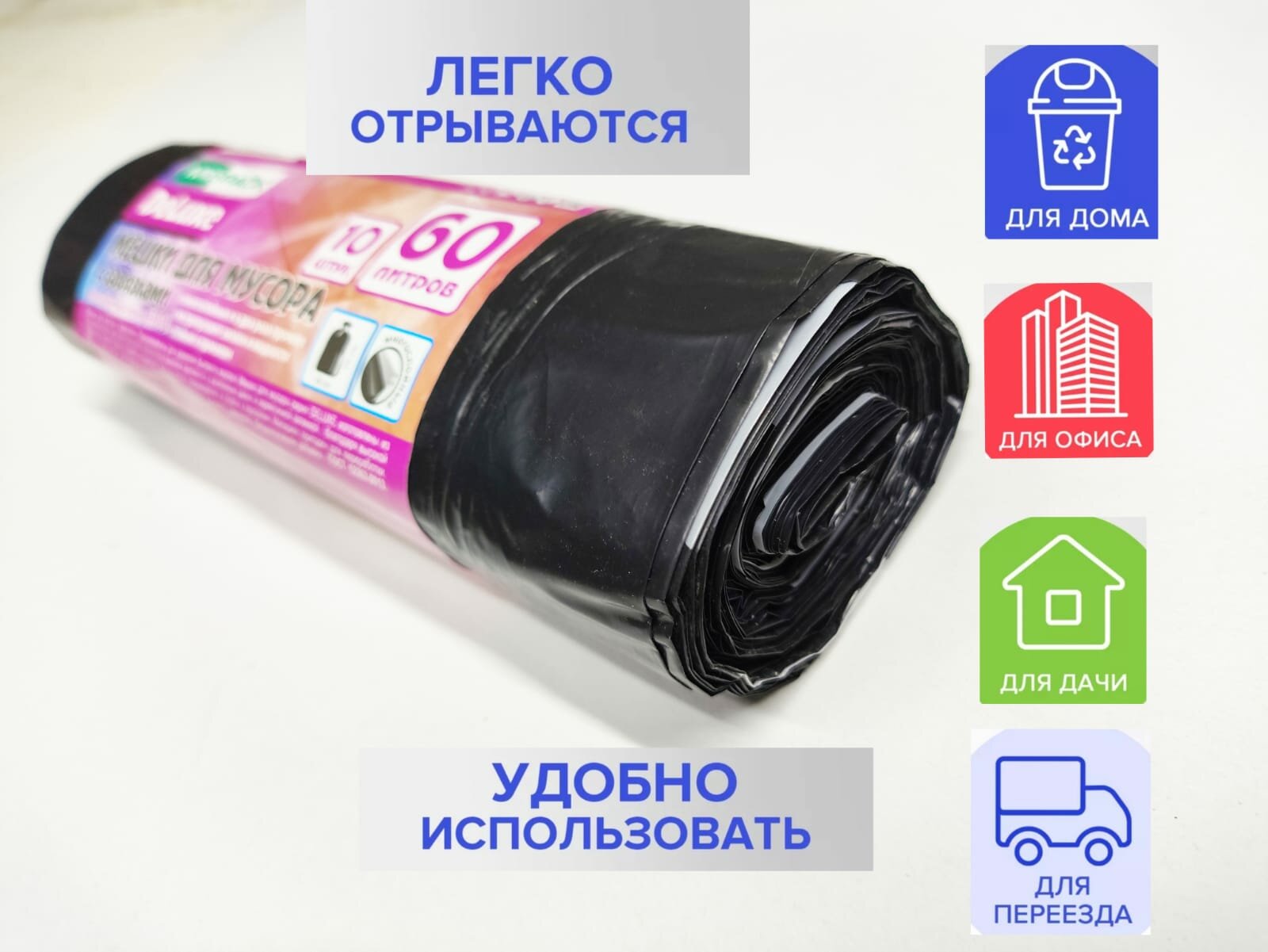 Мешки для мусора серии "DELUXE" с завязками 60 литров, в рулоне 10 штук,ПВД, 35 мкм, размер 60*70 см, черные