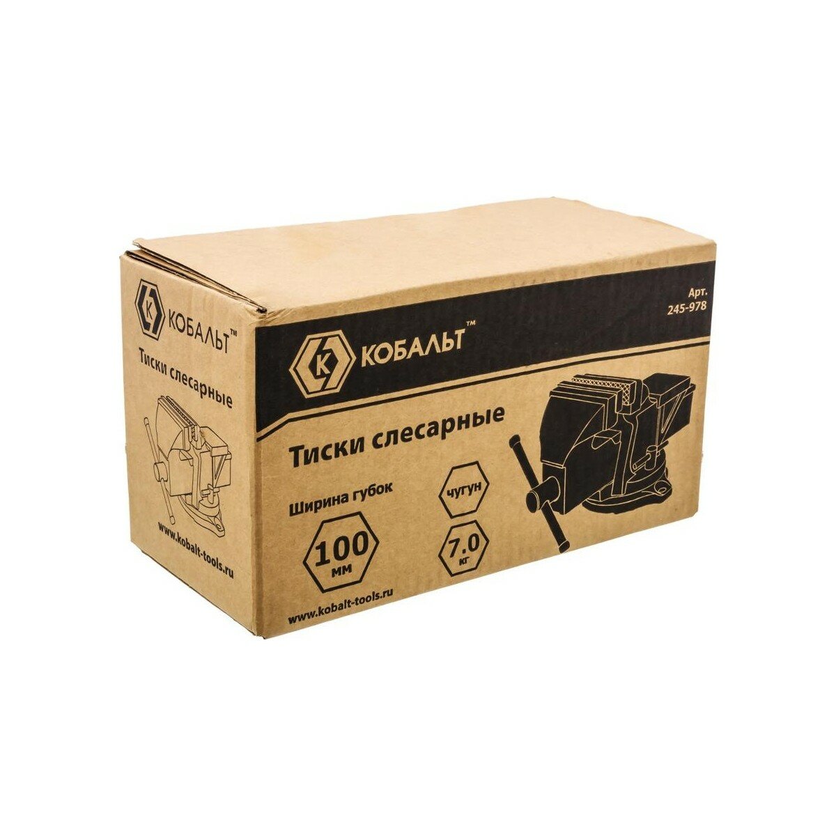 Тиски слесарные поворотные 100мм кобальт, захват 100 мм, 7 кг, наковальня, коробка