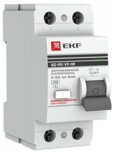 EKF Устройство защитного отключения УЗО ВД-100 2P 16А/ 10мА (электромеханическое) PROxima elcb-2-16-10-em-pro