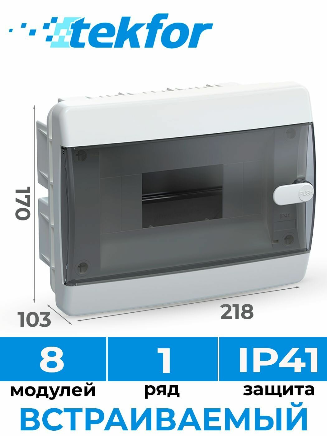 Распределительный щит Tekfor, встраиваемый 8 модулей IP41, прозрачная черная дверца серии С