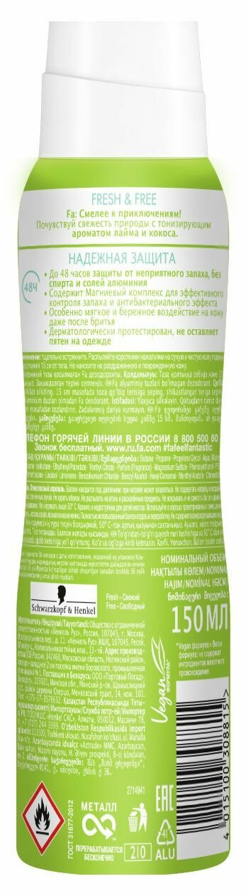 Фа Дезодорант Fresh&Free аромат лайма и кокоса, спрей, аэрозоль, 150 мл, 150 г, 1 шт.