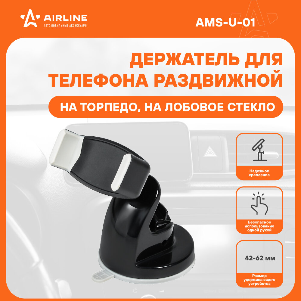 AIRLINE AMS-U-01 Держатель телефона универсальный 42-62 мм на лобовое стекло/панель черный AIRLINE AMS-U-01