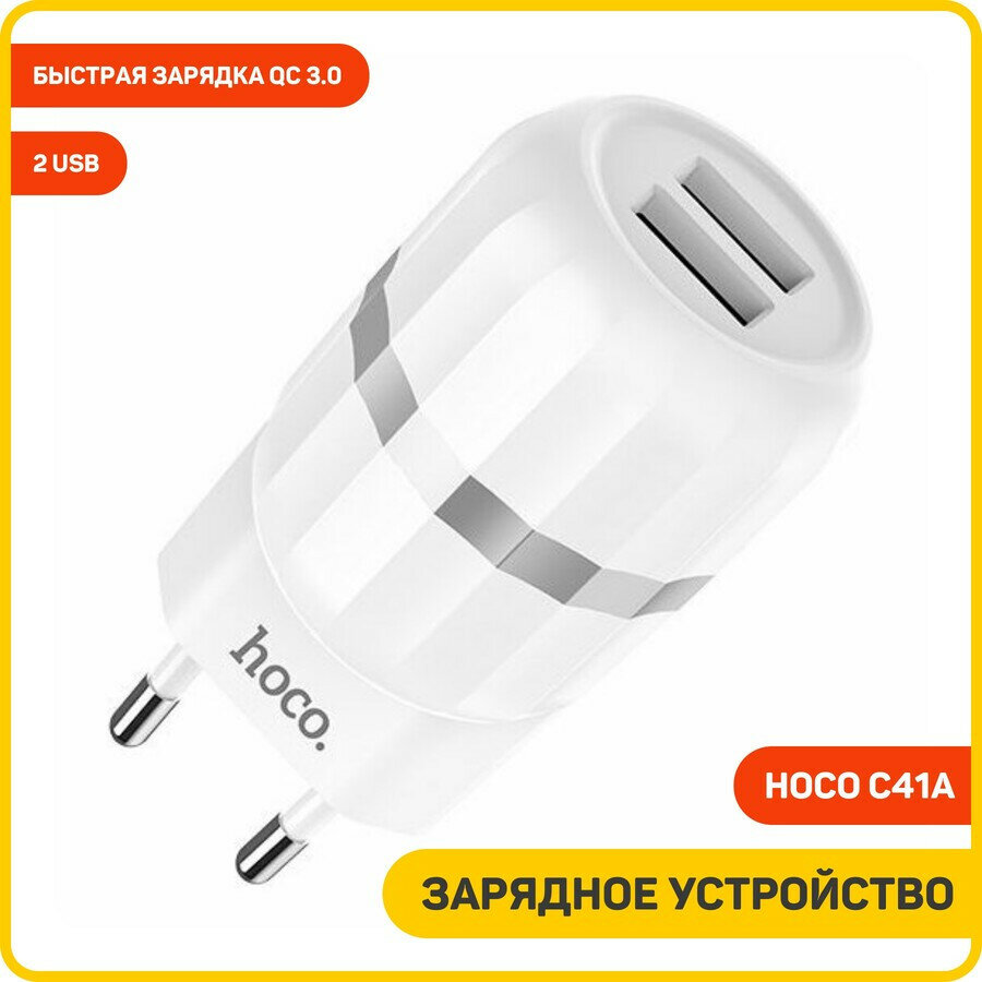 Сетевое зарядное устройство (СЗУ) Hoco C41A (2 USB) + кабель Type-C, 2.4 А, белый