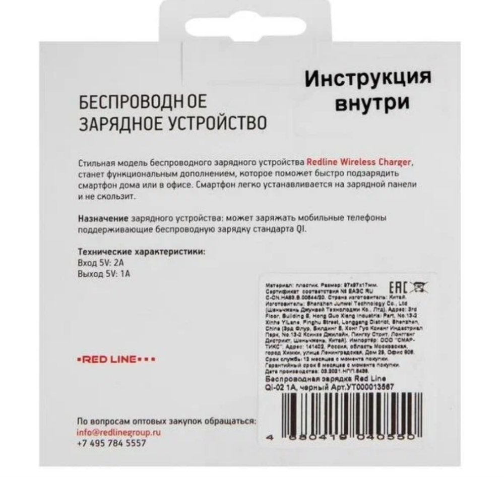 Беспроводное зарядное устройство Redline Qi-02 1A черный (УТ000013567)