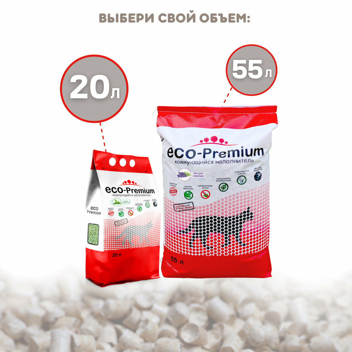 Наполнитель ECO-Premium комкующийся древесный с Зелеными гранулами, без запаха 20л, 7.6 кг