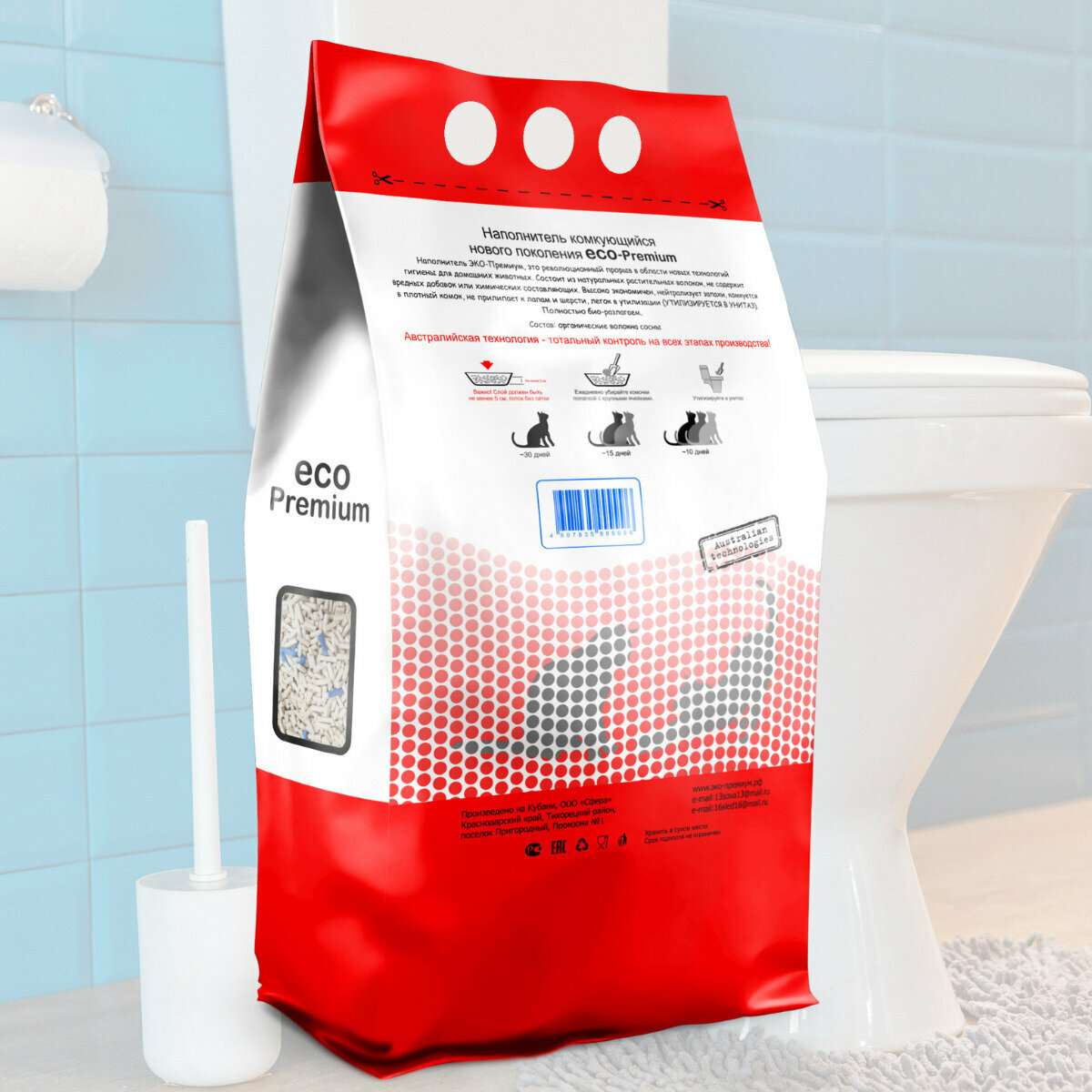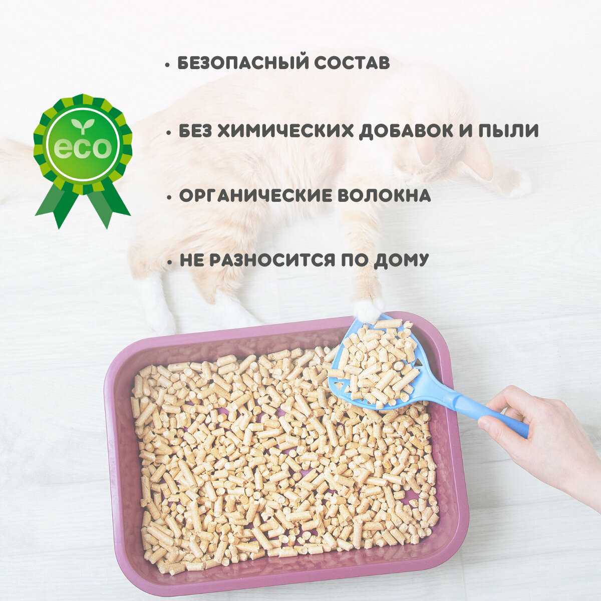 | Плюсы: | Не пылит, смывается в канализацию без последствий, не воняет |