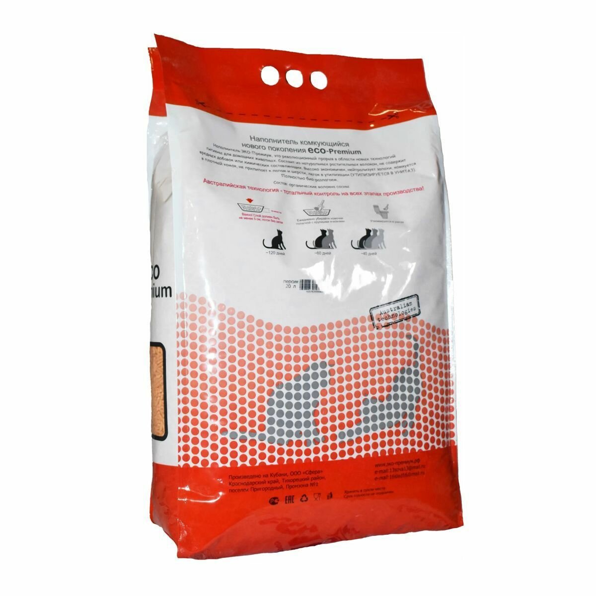 Комкующийся наполнитель, древесный с запахом персика ECO-Premium, оранжевый 7,6 кг, 20 л