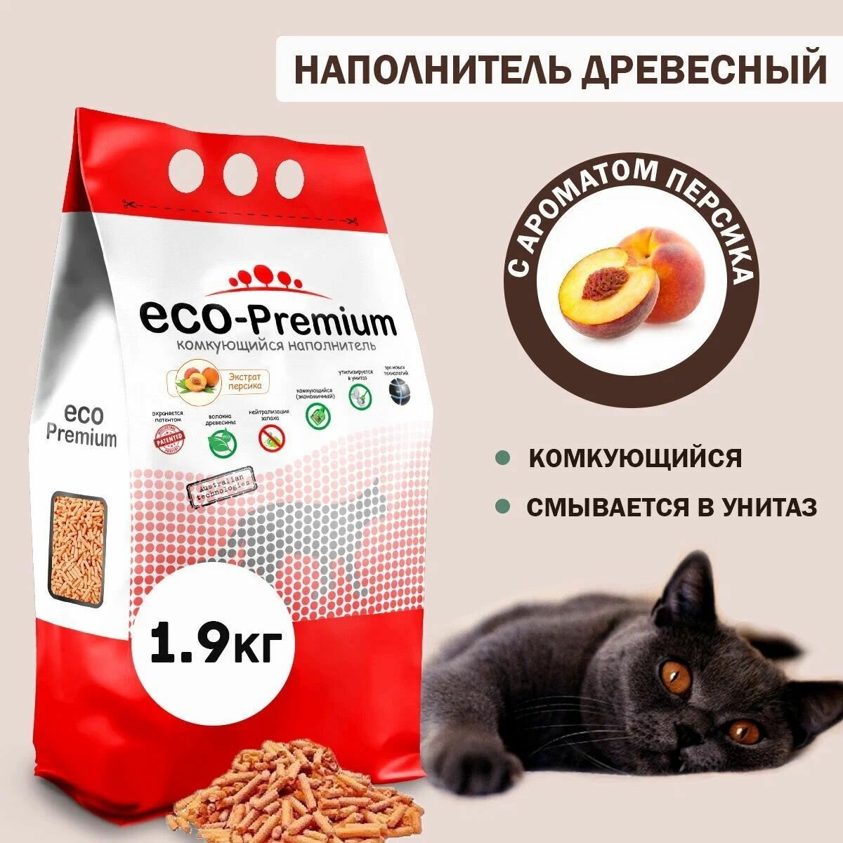 Наполнитель для кошачьего туалета комкующийся древесный с запахом персика ECO-Premium, упаковка 6 шт х 1,9 кг